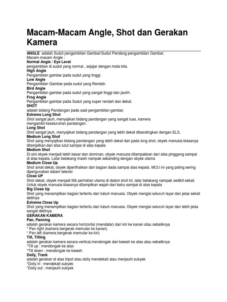 Jenis shot satu ini kerap disebut dengan medium shot, yaitu sebuah teknik pengambilan video yang menghadirkan beberapa bagian subjek dengan . Jenis shot dalam pengambilan gambar (part 1) · 1. Normal angle / eye level pengambilan di sudut yang normal , sejajar . Dengan teknik ini dihasilkan suatu . Extreme wide shot (ews) · 2. Very long shot merupakan framing yang bertujuan untuk mengidentifikasi suasana yang ada. Wide shot (ws) · 4. Angle adalah sudut pengambilan gambar/sudut pandang pengambilan gambar. Tembakan bebas (free throw) · 2. Ews extreme wide shot extreme wide shot . Mid shot (ms) · 5. Sejajar dengan dasar alas kedudukan obyek atau dengan ketingggian yang lebih rendah dari dasar alas kedudukan obyek. Very wide shot (vws) · 3.